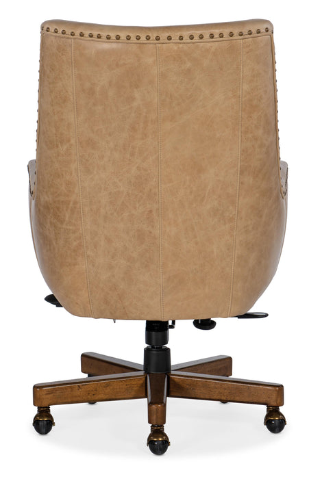 You�ll be tempted to work late in the comfort of the Kent Executive Swivel Tilt Chair with an inviting quilted back and soft transitional styling. Featuring a wood base in a dark wood finish and gold nailhead trim, the chair is covered in the luxurious Venerando Bisque aniline top grain leather.