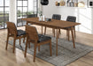 This 5-piece dining set is designed for stylish simplicity and convenience. Rectangular table has clean lines and rounded edges along with a natural finish. It includes a butterfly leaf that extends for when unexpected guests drop by. Four side chairs feature a flared back and grayish fabric that goes well with the table. This set is versatile and practical, perfect for a dining room with any decor.
