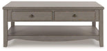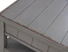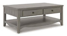 Put your love of European farmhouse styling on display. Finished with an antiqued gray chipped paint effect for an authentic vintage look, this coffee table is loaded with character. Two drawers and an open display shelf allow for storage and easy access to books, beverages and more.