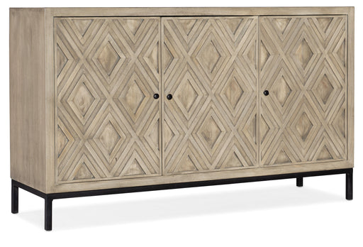 Hooker FurnitureOriginal price $3,492.07Current price $2,689.99| /A Pearl finish gives an elegant twist to the classic suzani pattern on antique metal fretwork adorning the Suzani Three-Door Entertainment Console....