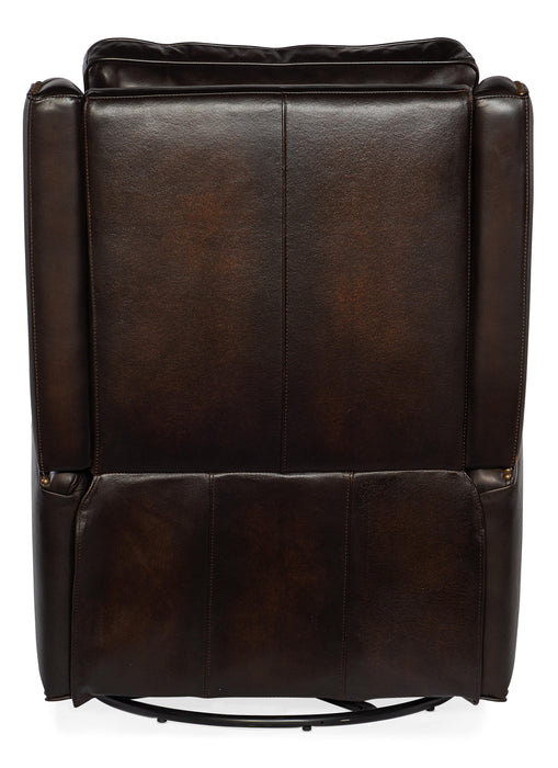 Tailored and timeless, the Kerley Power Swivel Glider Recliner is an instant casual classic. Featuring power recline , the Kerley is covered in the luxurious Sarzana Fortress finished top-grain leather with nailhead trim around the arms, base and sides.