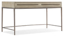 Svelte and sophisticated in a serene soft finish on Oak Veneers with tactile reeded drawer fronts, the Cascade Writing Desk is a stylish statement piece and a functional work-from-home solution. The Terrain finish on oak veneers is dry-brushed for a casual appeal and accented by champagne-colored bar pull hardware and slender metal legs joined by stretchers on the sides and back. The left drawer has one removable pencil tray with a felt bottom that can be used in either drawer, and the right drawer has one removable divider with two sides. Two reeded front drawers