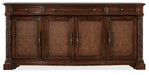 Inspired by the tropical craftsmanship of the West Indies and the woven cane accents of classic British and Dutch Colonial design, the Charleston buffet has four doors with cane fronts and intricately-carved botanical motifs on the end posts. Crafted of Cherry Veneers, Maple Inlay, Resin and Cane with a Solid-Wood Edge Top, it is finished in the vibrant Maraschino Cherry using natural grain Cherry Veneers. Behind the left and right doors and the center doors is one adjustable shelf. The left and right-side drawers are self-closing and have removable felt liners, the center self-closing drawer has a removable felt-lined silverware tray. All drawer interiors have a cherry finish, and the decorative bar pulls and round knobs have an antique bronze-colored finish. Ventilated back panel. Four doors with cane fronts, soft-close hinges and magnetic catches