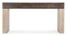 The contrasting natural wood and dark natural wood finishes are paired in an interlocking block design in the Commerce & Market Console Table. Crafted of Mindi Solids and Clean Acacia Solids, the table has a narrow rectangle shape.