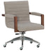 Cozy and comfortable yet urbane and modern, the Elon tilt Swivel Desk Chair has a pneumatic gas lift for adjustable height, a silver metal base on castors, and the channeled upholstered back and seat is covered in the Crafty Cement fabric. The Flat Cut Walnut Veneers wood trim on the arms is in a satin medium wood finish.