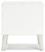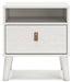 Dare to take minimalism to the max. This nightstand has an air of sleek simplicity thanks to its white painted finish with subtle replicated wood grain. Magnificently mod splay legs are a compelling complement to the streamlined design. And with two different faux leather drawer pulls that allow you to customize the nightstand to suit your space, there's no doubt about it: This contemporary piece is sure to become a classic.