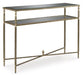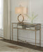 This sofa table gives traditional design a wonderful sense of relevance. Its details, which include embellished legs and a stretcher with a decorative center finial, are timeless classics. The aged goldtone coloration is the essence of relaxed elegance. An underlying shelf adds style, substance and functionality.