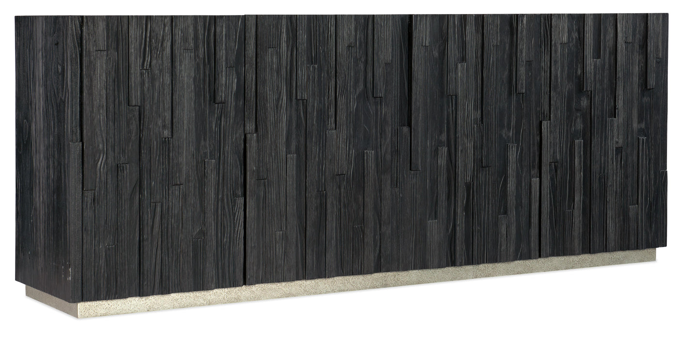Pine Veneers in a Charred Black finish featuring a Japanese technique to achieve the look of burnt wood create a truly unique piece in the Chapman Entertainment Console. Modern yet warm, and up-to-date while employing an ancient technique, this entertainment center is focal-point worthy while offering 4 doors with soft-close hinges and touch latches, 2 adjustable wood shelves behind each pair of doors, a ventilated back panel and a FC705 3-plug outlet. Accommodates up to an 80-inch TV. Four doors with soft-close hinges and touch latches