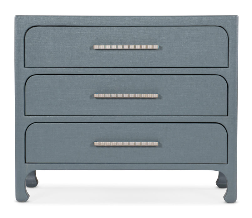 Inspired by casual waterfront living with a chic sophistication, the Cruiser Accent Chest is crafted of Wood and Raffia and finished in Reef Blue, a blue lacquered grasscloth. Chow-style legs and light champagne-colored decorative bar pulls add a designer touch.