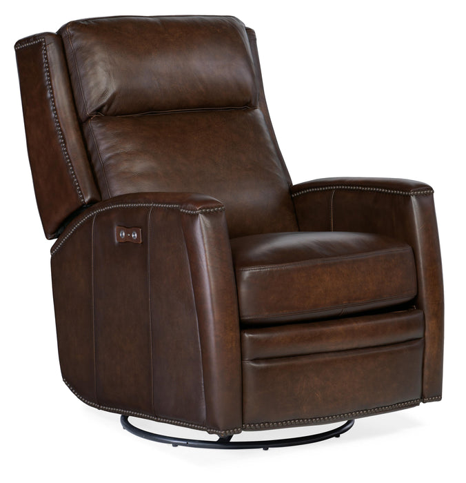 The Declan Power Recliner with Swivel Glider marries the ultimate in comfort with a stylish, classic silhouette featuring curved arms and antique gold nailhead trim around the arms and modified wing back. Covered in the warm brown Brindisi San Marco handwiped and finished leather. Includes USB port to charge your device while you relax. Traditional/Formal styling