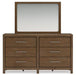 This dresser with mirror sits comfortably at the intersection of modern lodge and farmhouse aesthetics. Your warm and welcoming disposition is reflected in the charming architectural elements and light brown glazed finish. Even with its poise, the piece remains practical. Smooth-gliding drawers tuck away necessities, defining your bedroom with reliable function and style.