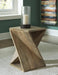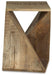 This accent table puts a new twist on vintage casual. Its brown finish is delightfully distressed, drawing attention to the saw mark planks arranged in an open architectural design. Place this unique piece next to a cozy chair to create a charming reading nook overflowing with visual intrigue.