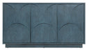 Brilliant in a soft blue finish with wood grain showing through and a subtle, oversized scallop motif on the door fronts, the Round Valley Entertainment Credenza sets the tone for a beautiful room. Accommodating up to a 65-inch TV, the credenza has 3 doors with soft-close hinges and push latches, two adjustable shelves behind the pair of left doors and one adjustable shelf behind the right side door. Vented back panel and 3-plug electrical outlet included.