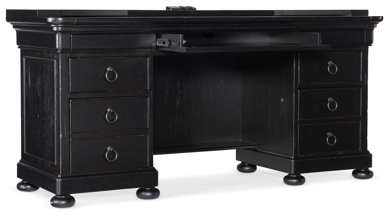 Casual yet refined and stylish, the Bristowe Computer Credenza sets a professional and inviting tone for any work-from-home space. Crafted of Pecan Veneers in a Tuxedo black paint finish with touches of warm brown and accentuated by 4 bun feet on each side of the desk, there are 7 drawers including the top left and right drawers with full extension metal ball bearing slides with removable divider inserts. The top drawers have finger grooves to open and the bottom drawers are locking file drawers with pendaflex filing system and full extension metal ball bearing slides. There is a FC627 power bar with 2 electrical outlets and 2 USB ports on top. The desk top area above the center drawer pulls out for added work surface.