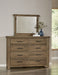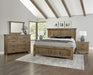 Vaughan Bassett Yellowstone 8 Drawer Dresser in Chestnut Natural 782-002. 60 Inch 8 drawer master dresser with all the splits; cracks; knot holes – all of the aging and refining that can only be provided by Mother Nature herself. Vaughan Bassett has developed a patent-pending process that allows them to accelerate how wood ages. We have kept the splits; knots; cracks; and the bold grain pattern found in Oak lumber to create this reclaimed look in this beautiful and unique bedroom.