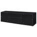 This sleek entertainment center combines a contemporary black finish with practical storage solutions. Made from durable engineered wood, it’s topped with a scratch-resistant eco-friendly laminate veneer. The unit includes two cabinets for concealed storage, an open shelf with a cable management hole for media devices, and a spacious drawer for organization. Its sturdy construction and modern silhouette make it a versatile piece for any entertainment setup.